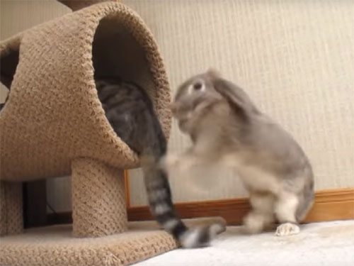 ウサギを、尻尾でビシバシ叩く猫